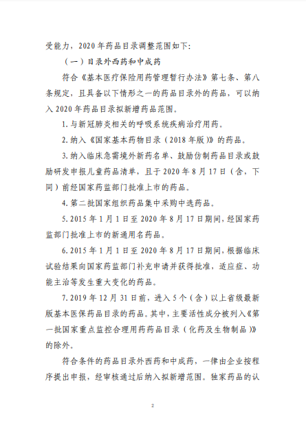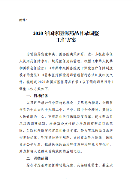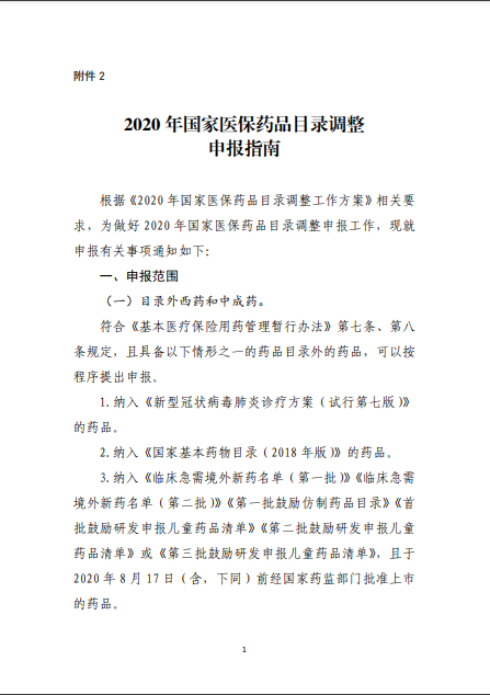 2020年8月3日-10日,國家醫(yī)療保障局就《2020年國家醫(yī)保藥品目錄調(diào)整工作方案(征求意見稿)》向社會公開征求了意見。8月17日,《2020年國家醫(yī)保藥品目錄調(diào)整工作方案》和《2020年國家醫(yī)保藥品目錄調(diào)整申報指南》正式公布。